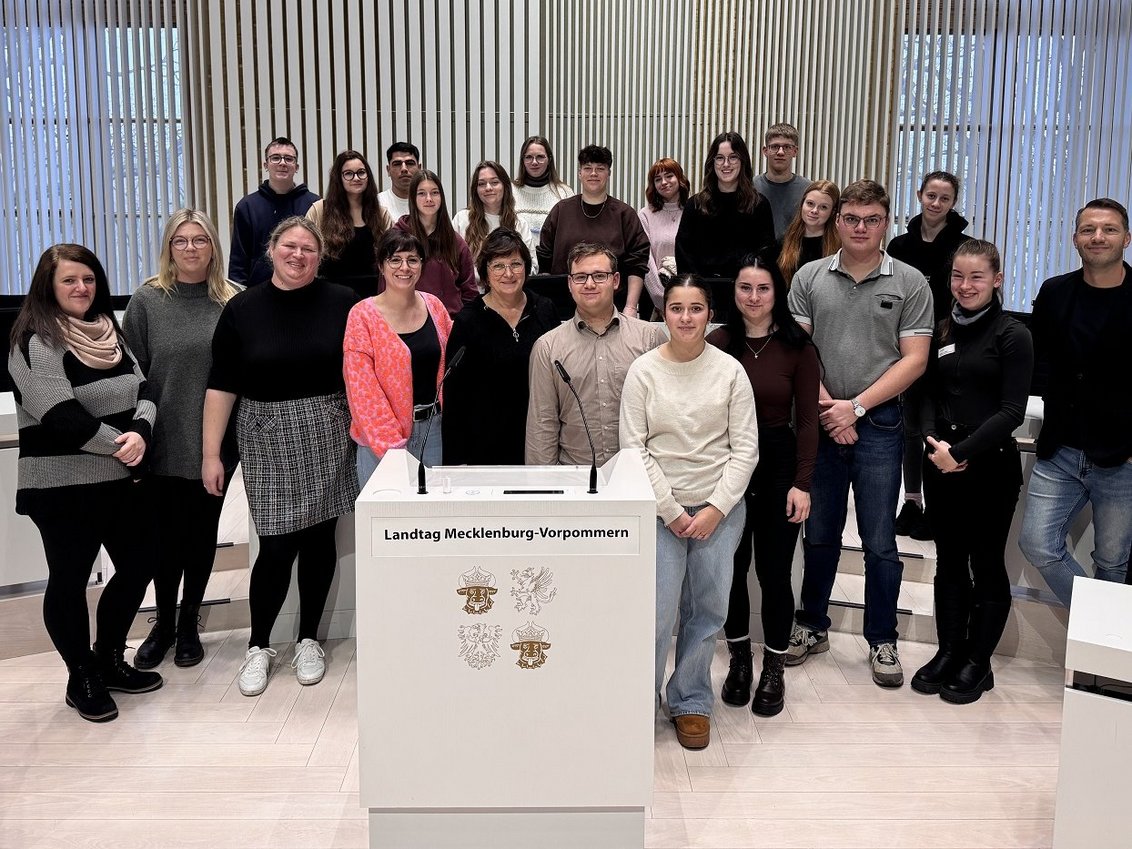 Pflegeauszubildende und Praxisanleiterinnen der AMEOS Klinika in Vorpommern besuchten auf Einladung von Patrick Dahlemann, Chef der Staatskanzlei Mecklenburg-Vorpommern, den Landtag und das Schweriner Schloss. Bei einem Austausch mit Patrick Dahlemann ging es um die Erwartungen der Auszubildenden, um die Herausforderungen in der Pflegeausbildung sowie gute Rahmenbedingungen für die Praxisanleitung und beruflichen Schulen. Die Runde war offen und wertschätzend – ein starkes Signal für die künftigen Pflegefachkräfte und die Bedeutung ihres Berufes.