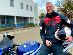 BU: Pflegefachkraft Tom Schmidt vor dem AMEOS Krankenhaus Haldensleben. Als Ausgleich zu seinem Job fährt er leidenschaftlich gern Motorrad.