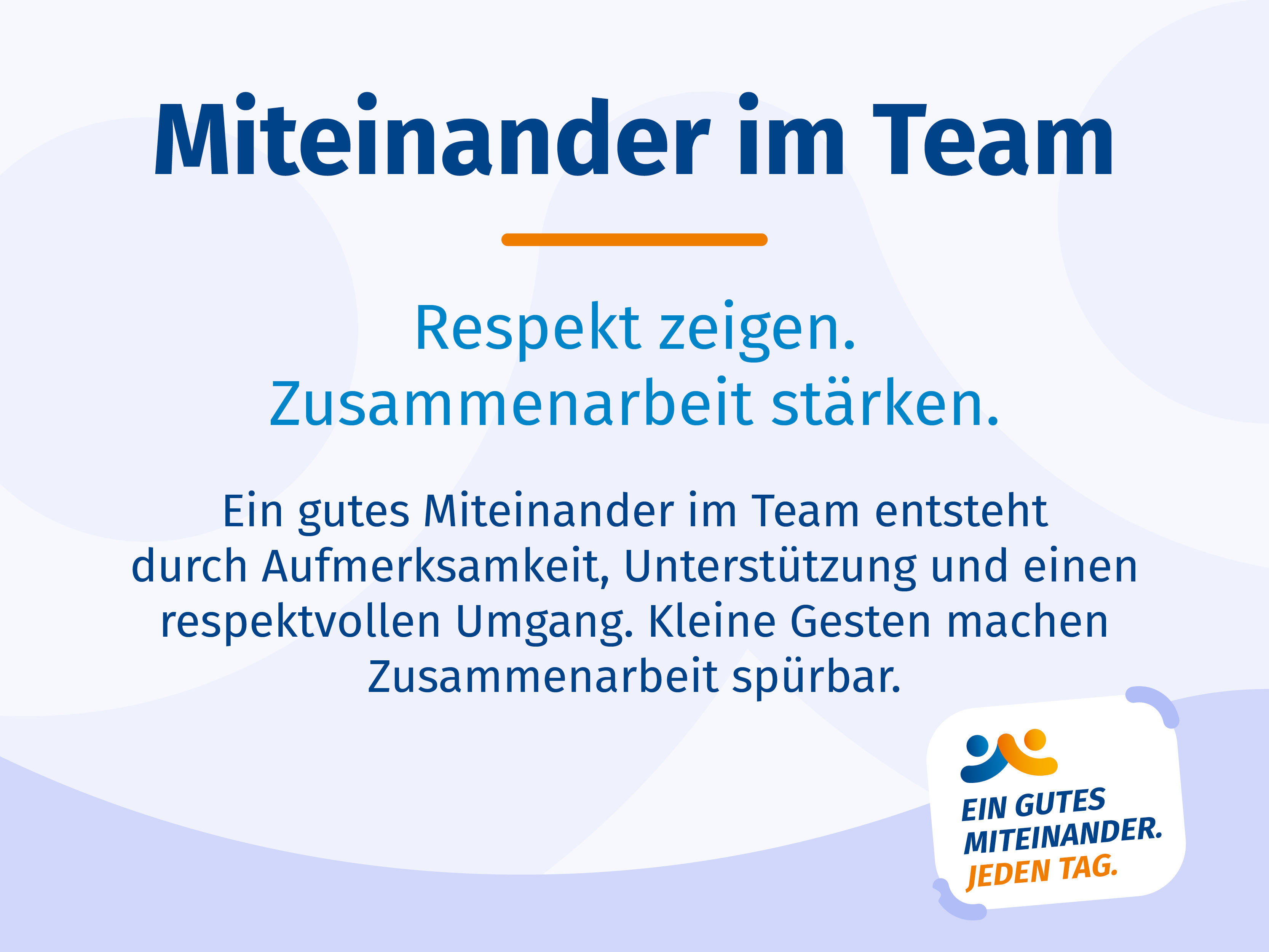 Ein respektvoller Umgang prägt unsere Zusammenarbeit, stärkt Teams und beeinflusst das Erleben unserer Patientinnen und Patienten. Diese Initiative macht sichtbar, was gutes Miteinander im Alltag bedeutet – und wie wir es gemeinsam gestalten können. Gutes Miteinander. Jeden Tag. |
