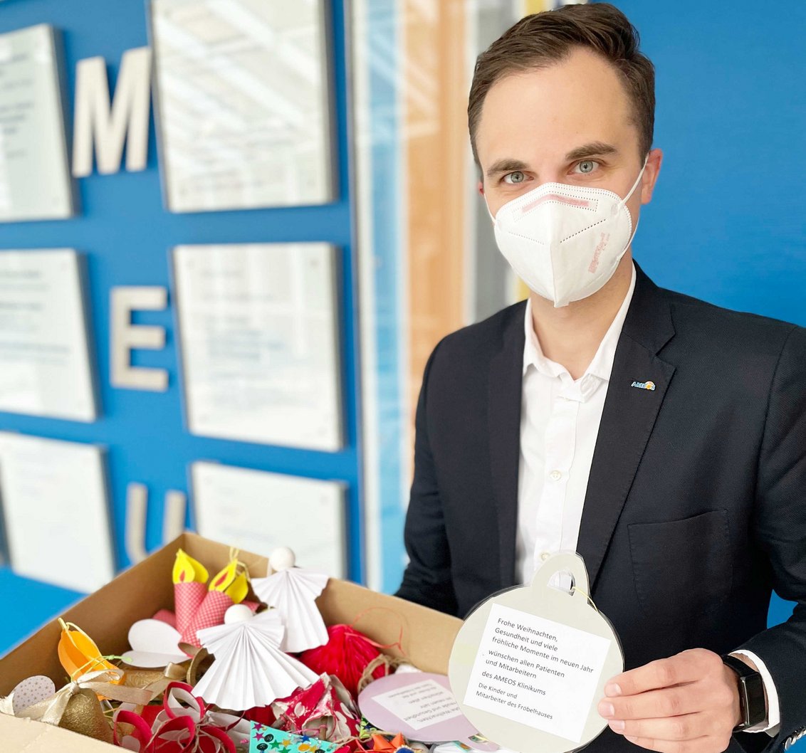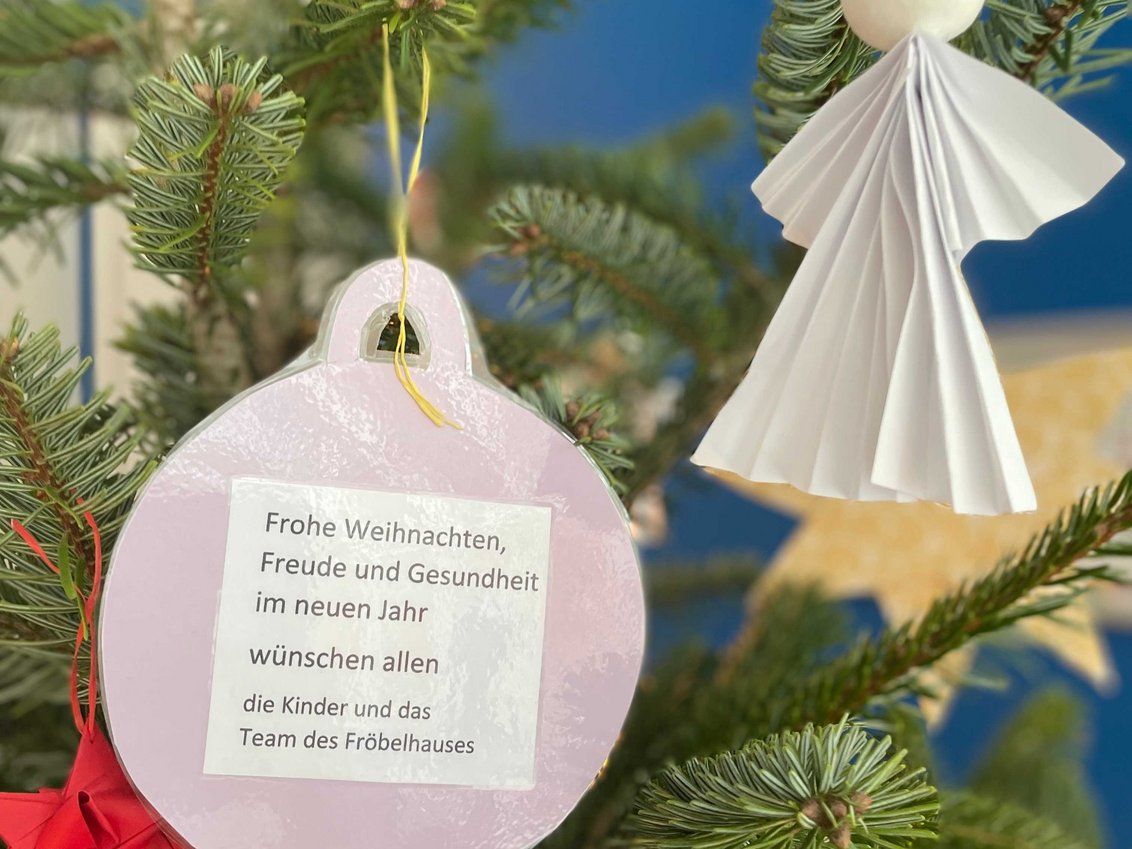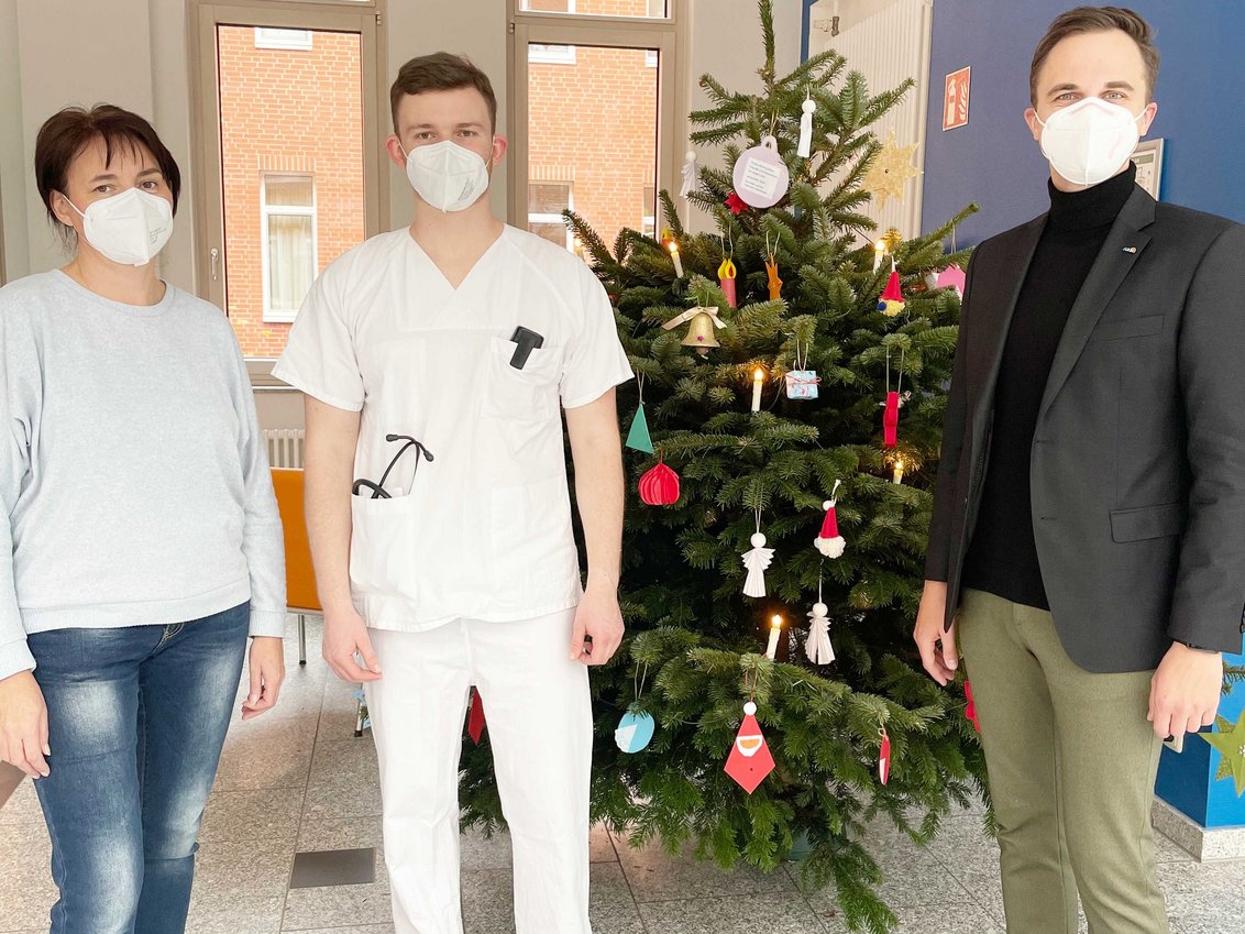 Den Baumschmuck haben wir den Kindern der KiTa Friedrich Fröbel zu verdanken. Eigens für die diesjährige Weihnachtszeit haben sie Engel, Sterne und Weihnachtsbäumchen für den Kliniktannenbaum gebastelt, den sie Michael Voland, stellventretender Krankenhausdirektor, natürlich persönlich übergeben haben.
