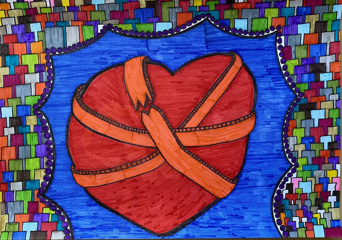 „Ich habe das Herz in einem anderen Werk gesehen und wollte es selbst zeichnen, da es mir so gefiel. Bei der Gestaltung des Umraums habe ich mich von meiner Vorliebe für Muster leiten lassen. Ich habe eine Vorliebe für expressive Farben, weil ich sie selber besser sehen kann – ich habe eine rot/grün Farbwahrnehmungs- störung.“