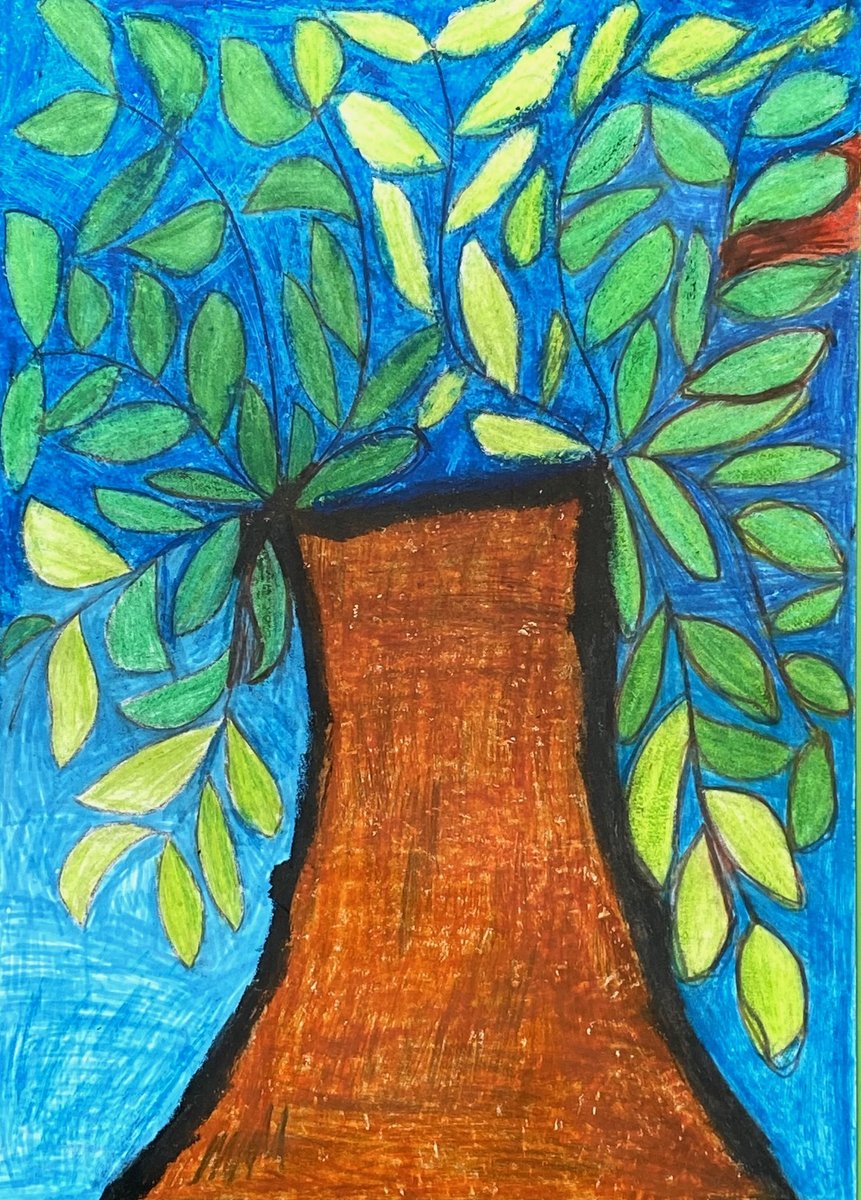 „Ich habe den einsamen Baum gemalt, weil ich die Natur ziemlich schön finde. Die Natur hat sogar auf der ganzen Welt, nicht nur einen Baum, sondern sehr viele verschiedene Arten an Bäumen. Meine Kunst ist: verschiedene Bäume zu malen, dazu gehören auch die vier Jahreszeiten. Das ist für mich ein Dauer-Projekt.“